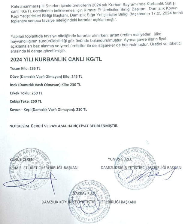 Bu fiyatlar, Kırmızı Et Üreticileri Birliği Başkanı, Damızlık Koyun Keçi Yetiştiricileri Birliği Başkanı ve Damızlık Sığır Yetiştiricileri Birliği Başkanı’nın ortak kararı sonucunda tavsiye niteliğinde açıklandı.